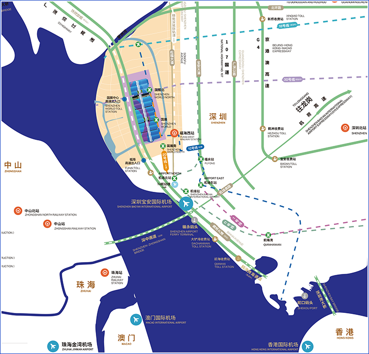 深圳国际会展中心紧邻深圳宝安国际机场,毗邻福永码头,紧挨广深沿江高速,直通地铁,接驳城轨,享有极其便利的交通资源。 航空:展馆位于深圳宝安国际机场以北,距深圳机场T3航站楼约7km,距T4枢纽仅3km,毗邻香港机场。 水路:临近福永码头,由福永码头乘船前往香港机场只需40分钟。 高速:紧临沿江高速,经由“国际会展中心”和“福海”两个收费站可直通展馆。 地铁: 地铁12号线、20号线直通展馆南、北登录大厅,可快速往返深圳市区及机场。 城轨:穗莞深城轨“福海西站”距展馆仅1km。 穿梭巴士:配备智慧公交,接驳地铁11号线塘尾站和机场,在展馆和周边的地铁站、巴士场站、商业中心区、酒店等地往返。 地铁12号线、20号线国展站C1、C2出口可直达展馆南登录大厅 地铁12号线、20号线国展北站C1、C2出口可直达展馆北登录大厅 深圳医博会.png深圳国际会展中心停车区域包括地面停车场和地下停车场,提供约1.3万多个车位。 深圳国际会展中心地下车场共计两层,提供9,045个车位,其中10%的地下停车位配有充电桩。 VIP停车位设置在南、北登录大厅附近,共有299个。 在展厅周围设有临时停车位4,054个,可供卡车、巴士和小车进行临时停放。